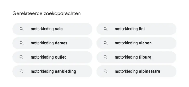 In bovenstaande afbeelding hebben we het zoekwoord ‘motorkleding’ gebruikt, waarbij Google een aantal interessante zoekwoorden weergeeft. Deze gerelateerde zoekwoorden helpen jou om jouw onderwerpen verder te specificeren. Als er een interessant zoekwoord tussen staat, kun je deze vervolgens weer gebruiken als zoekopdracht om wederom de gerelateerde zoekopdrachten te bekijken. Zo krijgt jouw zoekwoorden onderzoek steeds meer diepgang en achterhaal je zoekwoorden die echt relevant zijn voor jouw bedrijf!