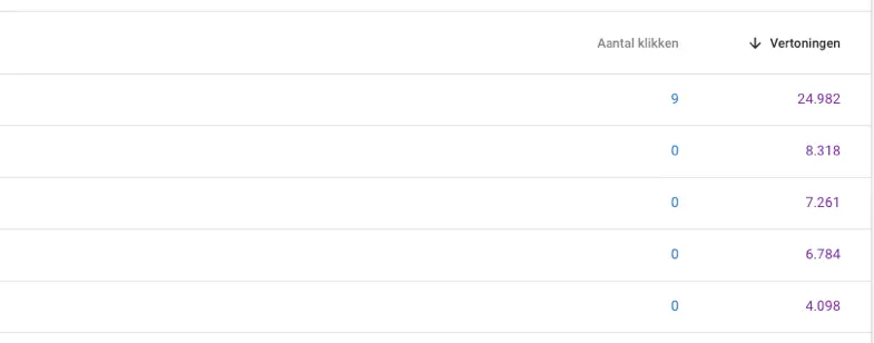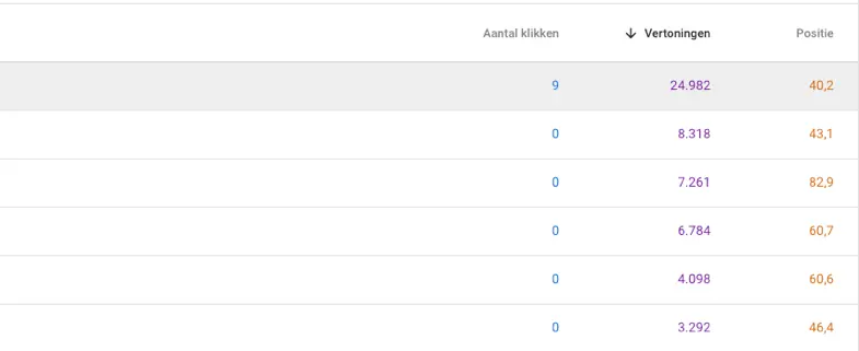 Het aantal vertoningen geeft aan hoe vaak je website getoond is bij een specifieke zoekopdracht. Daarnaast geeft het aantal klikken aan bij hoeveel van deze vertoningen er op jouw website als zoekresultaat is geklikt. Door de resultaten te sorteren op het aantal vertoningen, krijg je de zoekwoorden te zien waar je de meeste vertoningen hebt. Wat hier zo interessant aan is, is dat je nu kunt zien bij welke zoekwoorden jouw website vaak wordt weergegeven in de zoekresultaten, maar maar weinig klikken krijgt. Door Google Search Console hier de gemiddelde positie bij te laten weergeven, kun je bepalen welk van deze zoekwoorden interessant zijn om hogere posities voor te behalen. Dit zijn zoekwoorden die je eventueel kunt gaan optimaliseren.