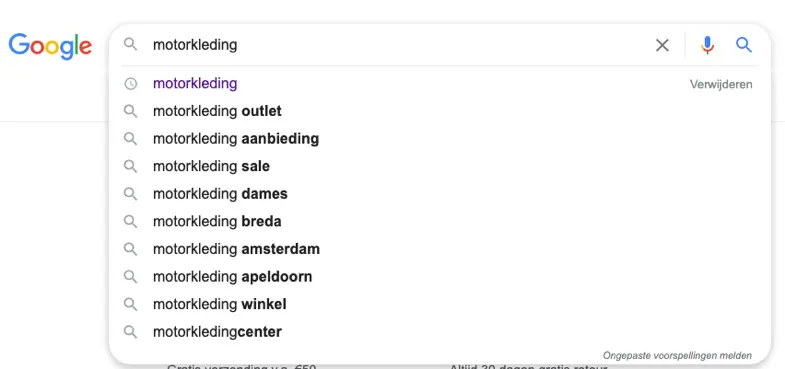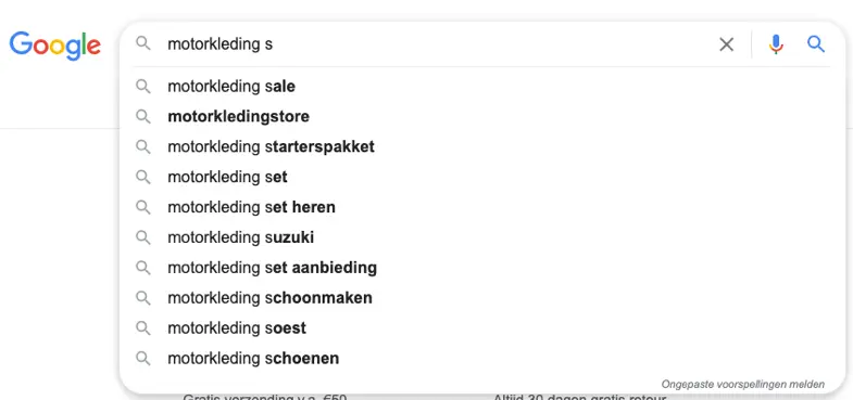 Type je bijvoorbeeld ‘motorkleding s’ in, dan krijg je alle suggesties die starten met de zoekopdracht ‘motorkleding s’.