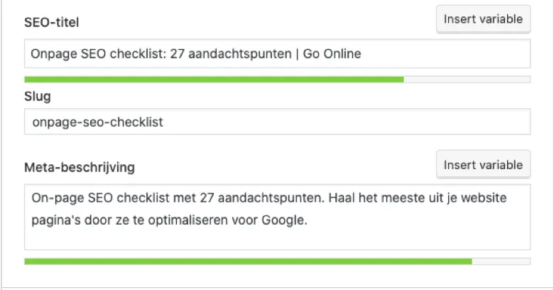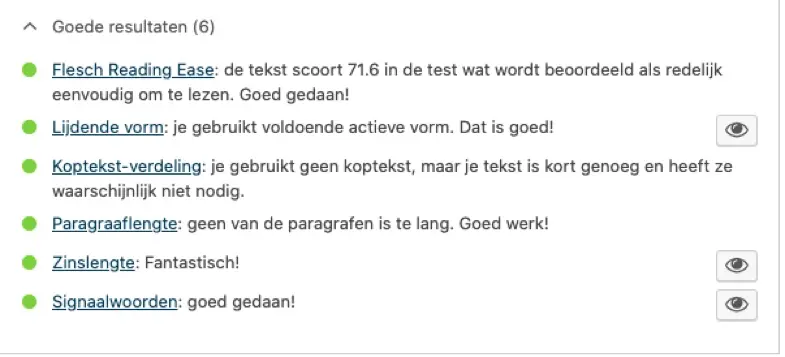 Controleer de on-page SEO op de pagina nog een keer voordat je een pagina publiceert. Gebruik een tool zoals Yoast om te controleren of je elk actiepunt van deze on-page SEO checklist hebt gedaan.