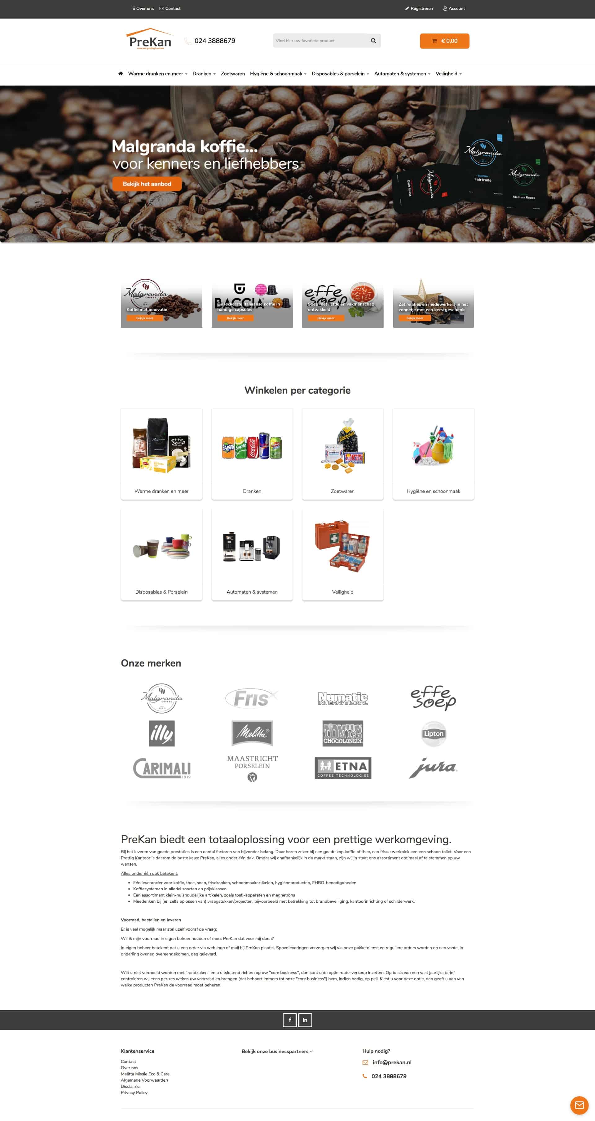 PreKan staat voor een Prettig Kantoor, en biedt een totaaloplossing voor een prettige werkomgeving. Zij leveren koffie, thee, koffiesystemen, huishoudelijke artikelen en nog veel meer. PreKan zorgt ervoor dat u altijd voldoende koffie, thee en andere kantoor artikelen op voorraad heeft.
