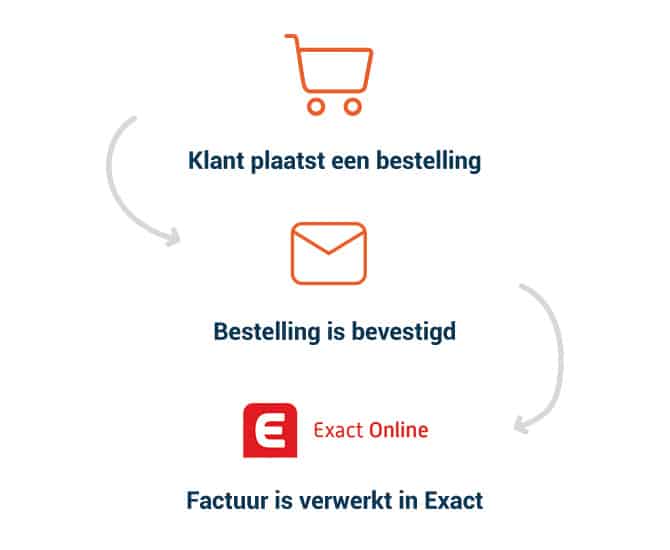 Nadat een klant het plaatsen van een bestelling heeft afgerond wordt er automatisch een verwerkte factuur in Exact Online aangemaakt, hierdoor hoeft de boekhouding enkel periodieke checks uit te voeren in plaats van deze orders handmatig verwerken.