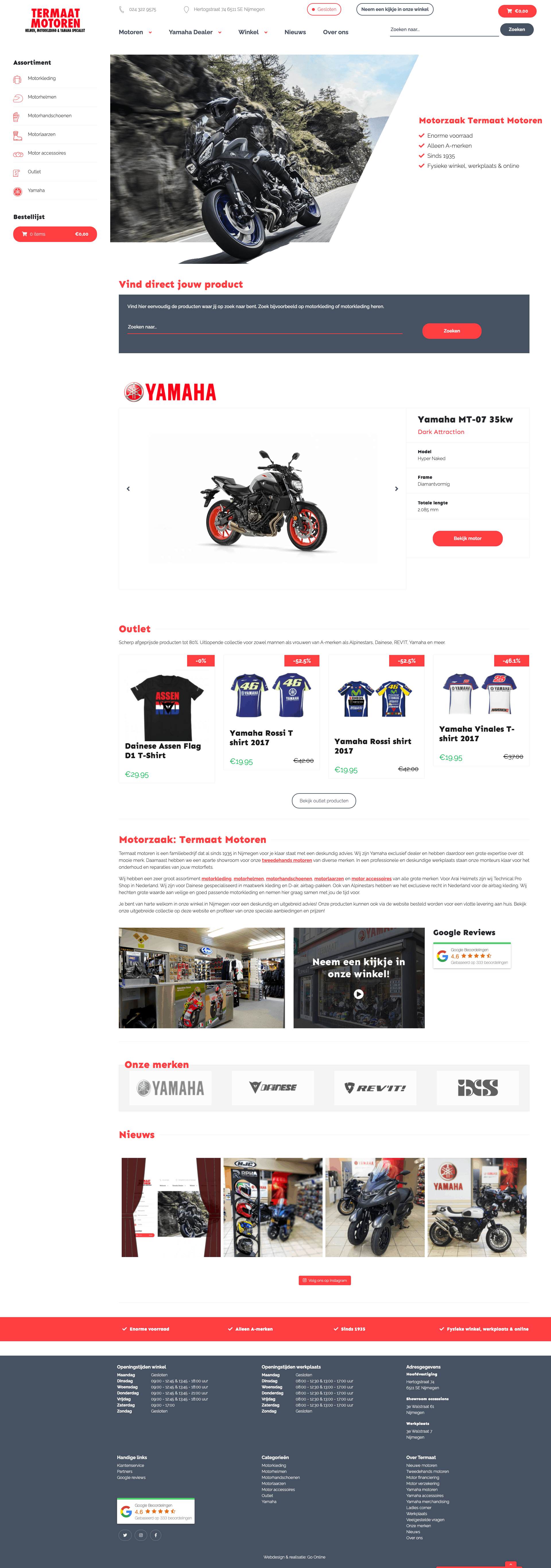 De vernieuwde homepage van Termaat Motoren is een complete samenvatting van de shop waarbij er een prominente plaats is gegeven aan het assortiment, de fysieke winkel en het verhaal van Termaat Motoren. Bezoekers kunnen direct zoeken naar producten, filteren op categorieën en navigeren naar de verschillende motoren en aanbiedingen. Daarnaast kunnen bezoekers een kijkje nemen in de winkel via Google Streetview!